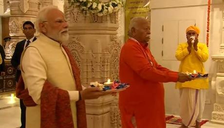 Ayodhya Ram Mandir flag hoisting:श्री राम जन्मभूमि मंदिर में ऐतिहासिक ध्वजारोहण से पहले PM मोदी और RSS प्रमुख मोहन भागवत ने वैदिक मंत्रोच्चार के बीच रामलला की पूजा और आरती की.