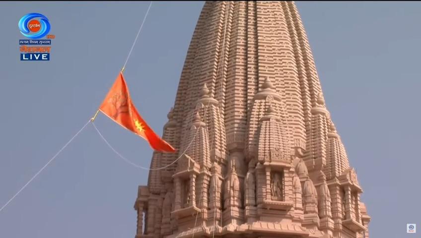 राम मंदिर के शिखर पर फहराए गया ये धर्मध्वज दस फुट ऊंचा और बीस फुट लंबा है. इस धर्म ध्वज पर एक तेजस्वी सूर्य की छवि है जो भगवान श्री राम की प्रतिभा और वीरता का प्रतीक है. इस पर कोविदारा वृक्ष की छवि के साथ एक 'ओम' अंकित है.