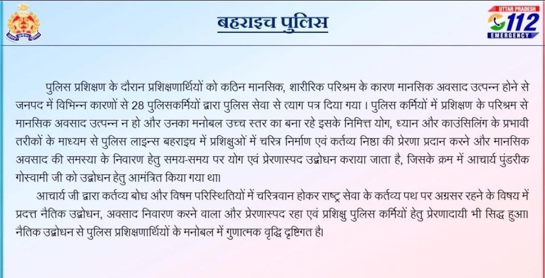 इस मामले में बहराइच पुलिस की ओर से भी जवाब आ गया है. बहराइच पुलिस के सोशल मीडिया हैंडल से जारी बयान में कहा गया है कि 'पुलिस प्रशिक्षण के दौरान प्रशिक्षणार्थियों को कठिन मानसिक शारीरिक परिश्रम के कारण मानसिक अवसाद उत्पन्न होने से जनपद में विभिन्न कारणों से 28 पुलिस कर्मियों ने पुलिस सेवा से त्यागपत्र दे दिया है. पुलिसकर्मियों में प्रशिक्षण के परिश्रम से मानसिक अवसाद उत्पन्न न हो और उनका मनोबल उच्च स्तर का बना रहे, इसके निमित्त योग ध्यान और काउंसलिंग के प्रभावी तरीकों से पुलिस लाइन में प्रशिक्षुओं के चरित्र निर्माण और कर्तव्यनिष्ठा की प्रेरणा प्रदान और मानसिक अवसाद की समस्या के निवारण हेतु यह कथा का आयोजन किया गया.'