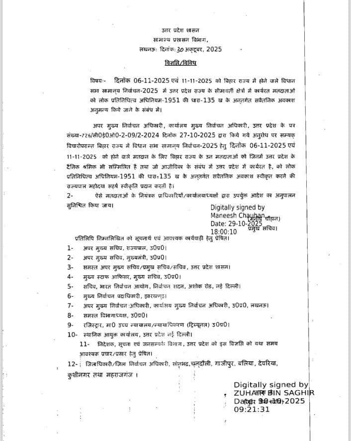 यूपी के सीमावर्ती जिलों में काम करने वाले बिहार के मतदाताओं को 6 और 11 नवंबर 2025 को वेतन सहित अवकाश देने का आदेश जारी किया गया है. इससे सरकारी कर्मचारी बिना किसी आर्थिक नुकसान के अपने राज्य में जाकर मतदान कर सकेंगे.