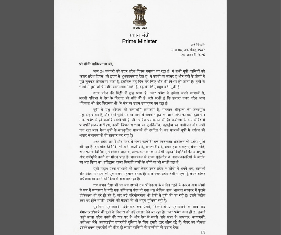 UP Diwas 2026: उत्तर प्रदेश स्थापना दिवस पर पीएम मोदी ने सीएम योगी को 2 पन्नों की चिट्ठी लिखी. जानें पत्र की मुख्य बातें, कैसे यूपी बना 'ग्रोथ इंजन' और 24 जनवरी 1950 से अब तक का सफर. राष्ट्रपति और गृह मंत्री ने भी दी बधाई.