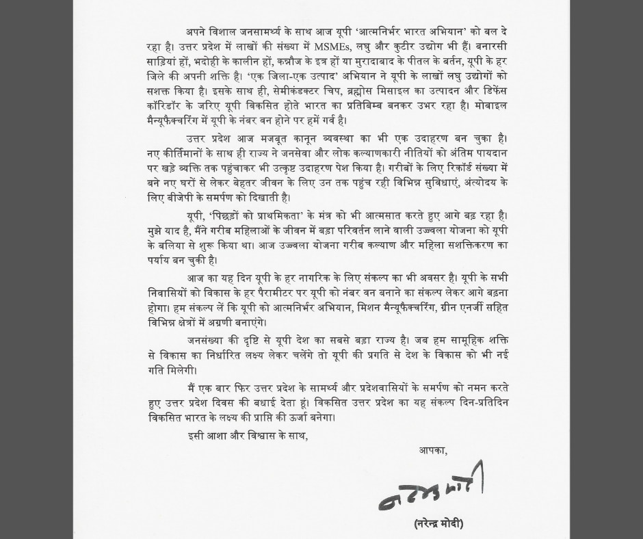 उत्तर प्रदेश आज अपना स्थापना दिवस मना रहा है. इस खास मौके पर देश के प्रधानमंत्री नरेंद्र मोदी ने मुख्यमंत्री योगी आदित्यनाथ को एक आत्मीय और भावपूर्ण पत्र लिखकर प्रदेशवासियों को बधाई दी है. यह पत्र केवल एक औपचारिक संदेश नहीं है, बल्कि इसमें उत्तर प्रदेश के साथ पीएम मोदी के गहरे व्यक्तिगत जुड़ाव और राज्य की बदलती तस्वीर की झलक साफ दिखाई देती है.