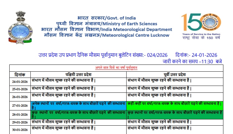 UP Weather Update: मौसम विभाग ने जानकारी दी है कि वर्तमान मौसम तंत्र अब कमजोर पड़ रहा है. पश्चिमी उत्तर प्रदेश में बारिश थमने और आसमान साफ होने के कारण आज सुबह से ही तापमान में गिरावट शुरू हो गई है. 27 और 28 जनवरी को प्रदेश के कई हिस्सों में फिर से बारिश की संभावना है.