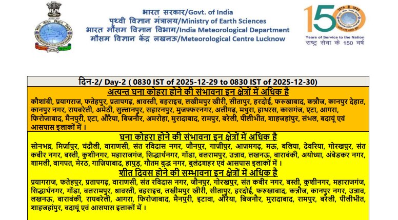 कोहरे के साथ-साथ बर्फीली हवाओं के कारण इन जिलों में दिन में भी धूप न निकलने की संभावना है, जिससे भारी ठिठुरन रहेगी:प्रयागराज, फतेहपुर, प्रतापगढ़, वाराणसी, संत रविदास नगर, जौनपुर, गोरखपुर, संत कबीर नगर, बस्ती, कुशीनगर, महाराजगंज, सिद्धार्थनगर, गोंडा, बलरामपुर, श्रावस्ती, बहराइच, लखीमपुर खीरी, सीतापुर, हरदोई, फरुखाबाद, कन्नौज, कानपुर नगर, उन्नाव, लखनऊ, बाराबंकी, रायबरेली, आगरा, फिरोजाबाद, मैनपुरी, इटावा, औरैया, बिजनौर, मुरादाबाद, रामपुर, बरेली, पीलीभीत, शाहजहांपुर, बदायूं एवं आसपास के इलाके.
