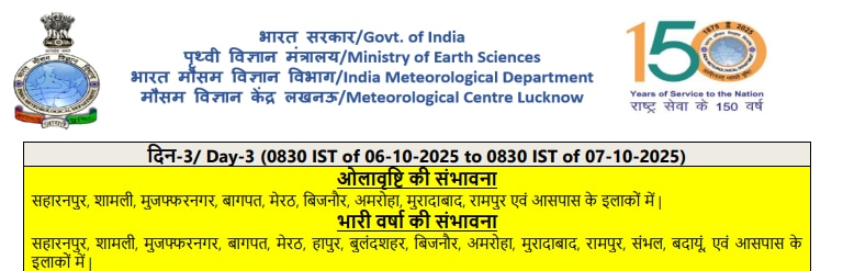 मौसम विभाग के अनुसार, कल यानी 6 अक्टूबर सहारनपुर, शामली, मुजफ्फरनगर, बागपत, मेरठ, बिजनौर, अमरोहा, मुरादाबाद, रामपुर में ओले गिरने की संभवना है.