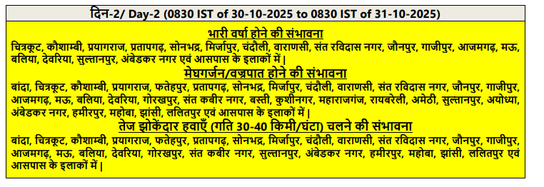 मौसम विभाग के पूर्वानुमान के मुताबिक, 30 नवंबर को चित्रकूट, कौशाम्बी, प्रयागराज, प्रतापगढ़, सोनभद्र, मिर्जापुर, चंदौली, वाराणसी, संत रविदास नगर, जौनपुर, गाजीपुर, आजमगढ़, मऊ, बलिया, देवरिया, सुल्तानपुर, अंबेडकर नगर तथा आसपास के इलाकों में भारी बारिश होने की प्रबल संभावना है.