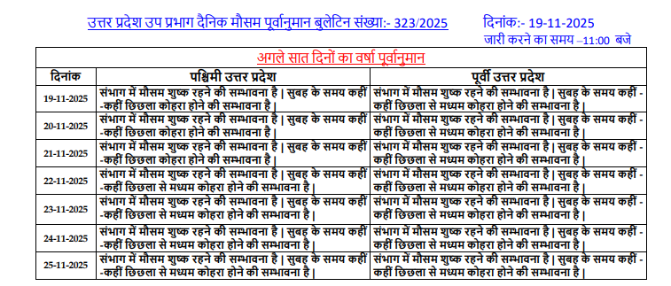 UP Weather Update: उत्तर प्रदेश में अगले एक सप्ताह तक मौसम का मिजाज कैसा रहेगा, इस लेकर भारतीय मौसम विभाग के लखनऊ केंद्र ने अपना ताजा पूर्वानुमान जारी कर दिया है. मौसम विभाग ने बताया अपने लेटेस्ट बुलेटिन में बताया है कि पूरे प्रदेश में फिलहाल बारिश की कोई संभावना नहीं है. हालांकि, सुबह के समय कोहरा छाया रहेगा. यह पूर्वानुमान 20 नवंबर से 25 नवंबर 2025 तक के लिए दिया गया है.