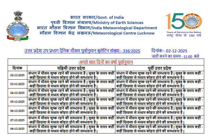 मौसम विभाग के अनुसार, 3 दिसंबर से लेकर 8 दिसंबर 2025 तक चाहे वह पश्चिमी उत्तर प्रदेश हो या पूर्वी उत्तर प्रदेश दोनों ही संभागों में मौसम शुष्क रहने की सम्भावना है. यानी इस पूरे सप्ताह में राज्य के किसी भी हिस्से में बारिश होने की कोई आशंका नहीं है. इस वजह से किसानों को अपने कृषि कार्यों को बिना किसी रुकावट के पूरा करने में मदद मिलेगी.