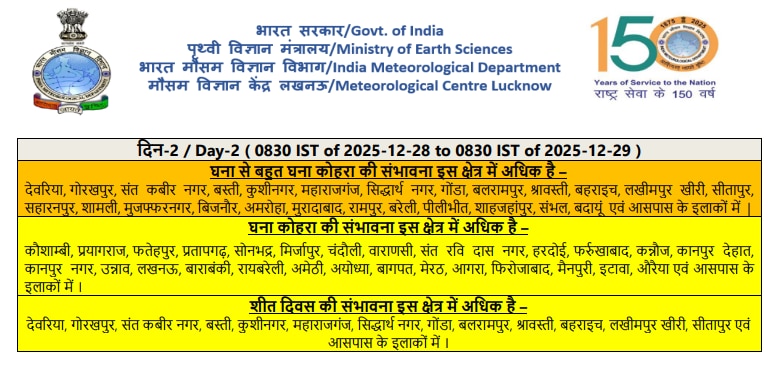 कोहरे के साथ-साथ इन जिलों में दिन का तापमान सामान्य से काफी नीचे रहेगा, जिससे भारी ठिठुरन महसूस होगी- देवरिया, गोरखपुर, संत कबीर नगर, बस्ती, कुशीनगर, महाराजगंज, सिद्धार्थ नगर, गोंडा, बलरामपुर, श्रावस्ती, बहराइच, लखीमपुर खीरी, सीतापुर एवं आसपास के इलाके.