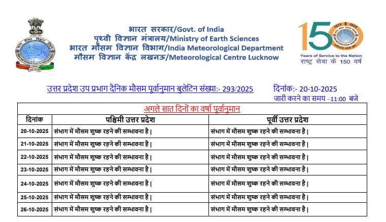 मौसम विशेषज्ञों के अनुसार, मानसून की वापसी के बाद से प्रदेश में मौसम पूरी तरह से बदल चुका है. अगले कई दिनों तक उत्तर प्रदेश में बारिश की कोई संभावना नहीं है. अब मौसम शुष्क ही बना रहेगा और पूरी तरह से सर्दियों की ओर बढ़ेगा. दिवाली के बाद पहाड़ों से आने वाली हवाओं के कारण ठंड का असर तेजी से बढ़ना शुरू हो जाएगा और अक्टूबर के अंत तक कड़ाके की सर्दी महसूस होने लगेगी.