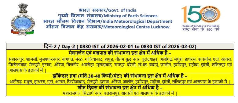 UP Weather Update: उत्तर प्रदेश में कड़ाके की ठंड के बीच अब कुदरत का दोहरा प्रहार होने वाला है. मौसम विभाग (IMD) ने आज यानी 1 फरवरी को प्रदेश के अधिकांश हिस्सों के लिए येलो अलर्ट जारी किया है. विभाग के मुताबिक, आज प्रदेश के कई हिस्सों में मेघगर्जन और वज्रपात (बिजली गिरने) के साथ हल्की बारिश होने की संभावना है. पश्चिमी यूपी से लेकर बुंदेलखंड तक के जिलों में गरज-चमक के साथ बारिश और तेज हवाओं का दौर शुरू होने की संभावना है.
