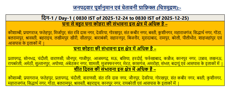 यूपी में क्रिसमस पर मौसम का मिजाज: 25 दिसंबर को प्रयागराज, गोरखपुर और मेरठ समेत कई जिलों में घने कोहरे और 'शीत दिवस' का अलर्ट.देखें जिलों की पूरी सूची.