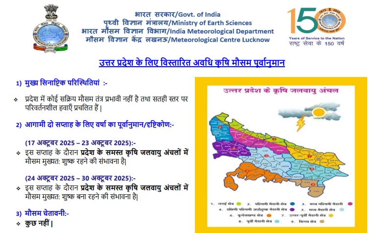 मौसम विभाग के अनुसार, 18 अक्टूबर से लेकर 23 अक्टूबर तक प्रदेश के सभी कृषि जलवायु अंचलों में मौसम मुख्य रूप से शुष्क रहने की संभावना है. इन दो हफ्तों के दौरान बारिश का कोई पूर्वानुमान नहीं है. मालूम हो कि इस बीच 20 अक्टूबर को दिवाली का त्योहार मनाया जाएगा.
