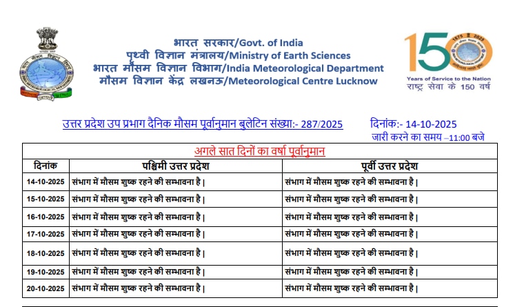शुष्क मौसम: 16 अक्टूबर से 20 अक्टूबर तक पश्चिमी और पूर्वी उत्तर प्रदेश, दोनों हिस्सों में मौसम पूरी तरह से शुष्क रहने की संभावना है.