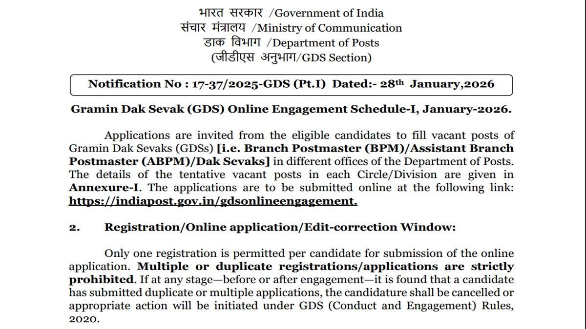 डाक विभाग ने यह भर्ती ग्रामीण डाक सेवक (GDS) के विभिन्न पदों के लिए निकाली है, जिसमें ब्रांच पोस्टमास्टर (BPM), असिस्टेंट ब्रांच पोस्टमास्टर (ABPM) और डाक सेवक शामिल हैं. चयनित उम्मीदवारों को ग्रामीण क्षेत्रों में डाक सेवाओं की जिम्मेदारी सौंपी जाएगी.