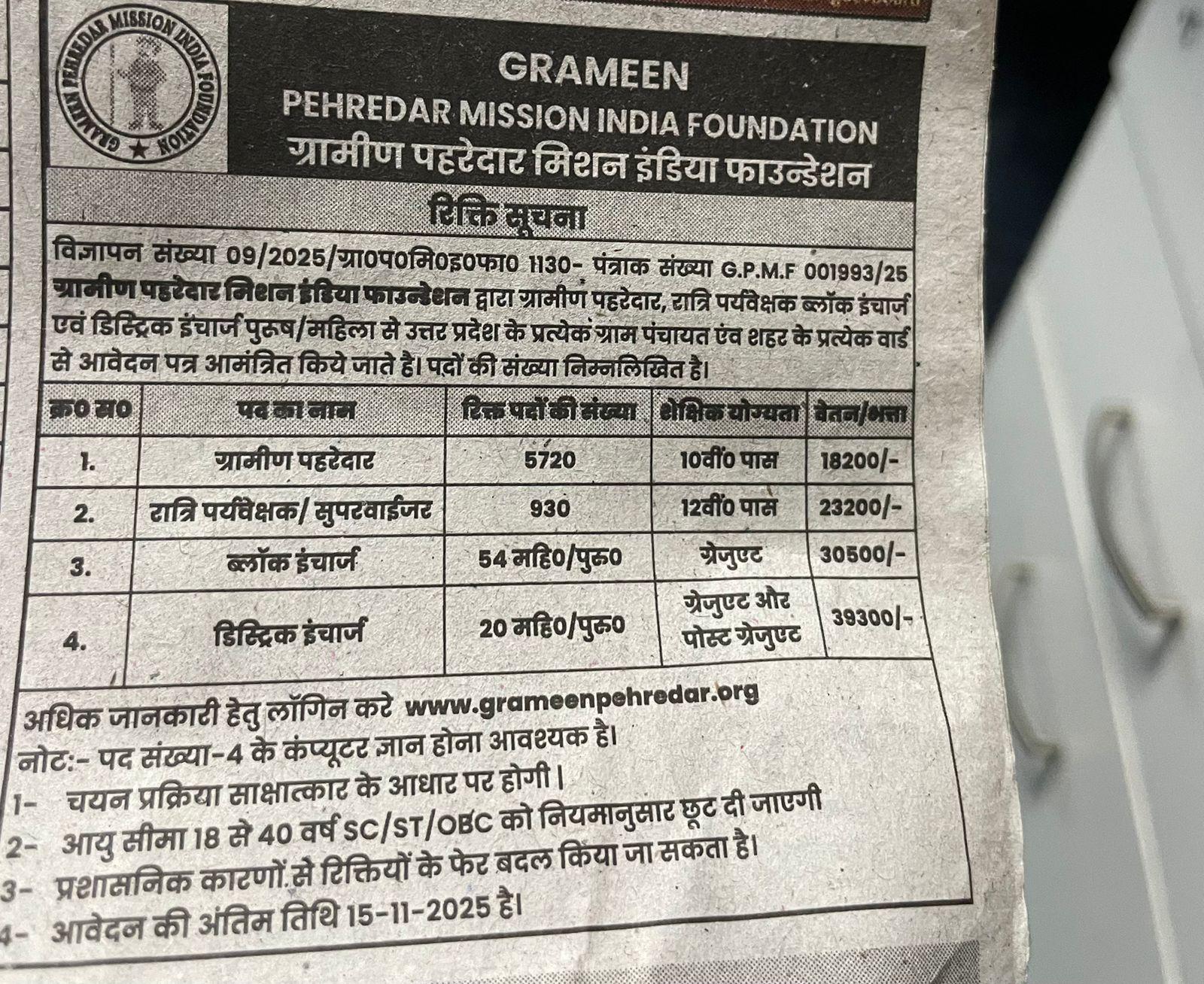 उत्तर प्रदेश के ग्रामीण इलाकों में सुरक्षा सुनिश्चित करने की दिशा में बड़े पैमाने पर नौकरी का मौका भी सामने आया है. ग्रामीण पहरेदार मिशन इंडिया फाउंडेशन ने ग्रामीण पहरेदार, रात्रि पर्यवेक्षक/सुपरवाइजर, ब्लॉक इंचार्ज और डिस्ट्रिक इंचार्ज के 5900 से अधिक पदों पर यूपी के सभी गांवों और शहरी वॉर्ड से आवेदन मंगवाए हैं. इसके लिए 10वीं पास से लेकर ग्रैजुएट करने वाले लोग एलिजिबल हैं. आवेदन की अंतिम तिथि 15 नवंबर 2025 तक है. आइए आपको विस्तार से इसकी जानकारी देते हैं.