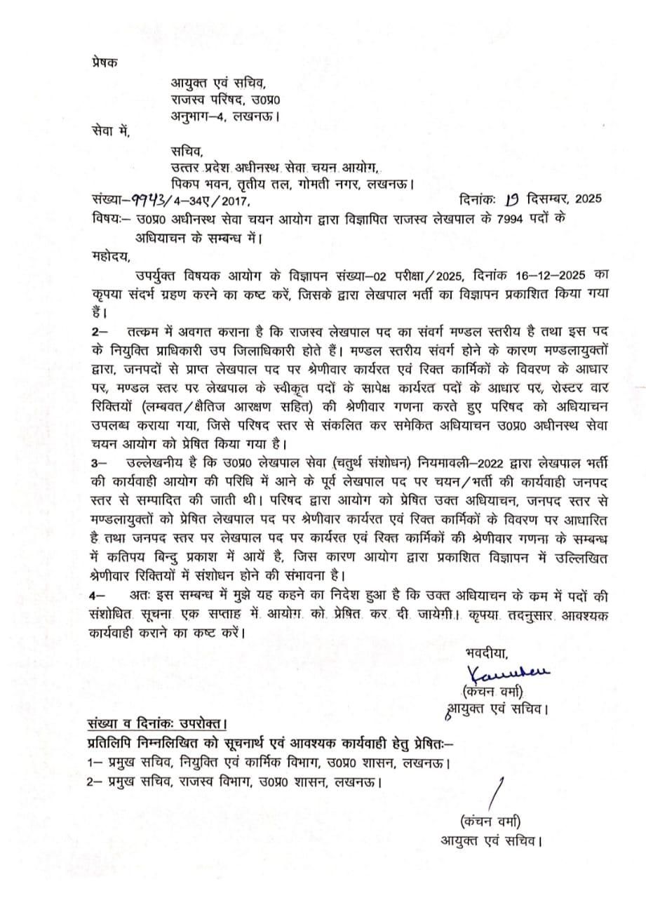 बता दें कि आयुक्त राजस्व परिषद ने उत्तर प्रदेश अधीनस्थ सेवा चयन आयोग को पत्र भेजकर कहा है कि लेखपाल भर्ती से जुड़ी पदों का संशोधित जानकारी एक सप्ताह के अंदर दी जाए. इसके साथ ही जो 7994 लेखपाल पद खाली बताए जा रहे हैं, उनकी संख्या की दोबारा जांच कर नियम के अनुसार आगे की कार्रवाई करने के निर्देश भी दिए गए हैं.