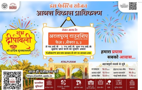 Agra ADA Atalpuram Township Update: दीपावली के त्योहारी अवसर पर आगरा विकास प्राधिकरण (ADA) ने शहर में अपने घर का सपना देख रहे लोगों के लिए एक नई आवासीय योजना की घोषणा की है. प्राधिकरण ने अपनी महत्वाकांक्षी 'अटलपुरम टाउनशिप' परियोजना के तहत फेज 1 के सेक्टर 2 और 3 में प्लॉट्स के लिए पंजीकरण प्रक्रिया शुरू कर दी है.