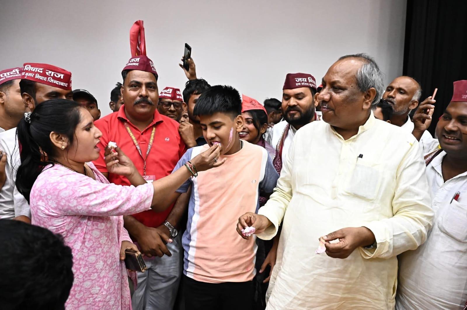 नीचे शेयर की गई तस्वीर में नीलू के पति लाल शर्ट में हैं. बच्चे को केक खिला रहीं महिला नीलू हैं. इस तस्वीर में निषाद पार्टी चीफ संजय निषाद भी हैं.