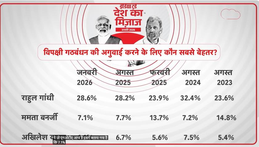 विपक्षी गठबंधन INDIA में लीडर को लेकर अक्सर सवाल उठते रहे हैं.ममता बनर्जी, अरविंद केजरीवाल और अखिलेश यादव के समर्थकों की अपनी-अपनी दलीलें हैं. लेकिन जनवरी 2026 के MOTN सर्वे ने साफ कर दिया है कि प्रधानमंत्री मोदी के सामने विपक्ष का चेहरा बनने की रेस में फिलहाल कौन सबसे मजबूत है. बता दें कि MOTN सर्वे में जब लोगों से सवाल पूछा गया कि विपक्षी गठबंधन की अगुवाई करने के लिए कौन नेता सबसे बेहतर साबित होगा तो सबसे ज्यादा 28.6% लोगों ने जिस नाम पर भरोसा जताया है वह काफी चौंकाने वाला है.