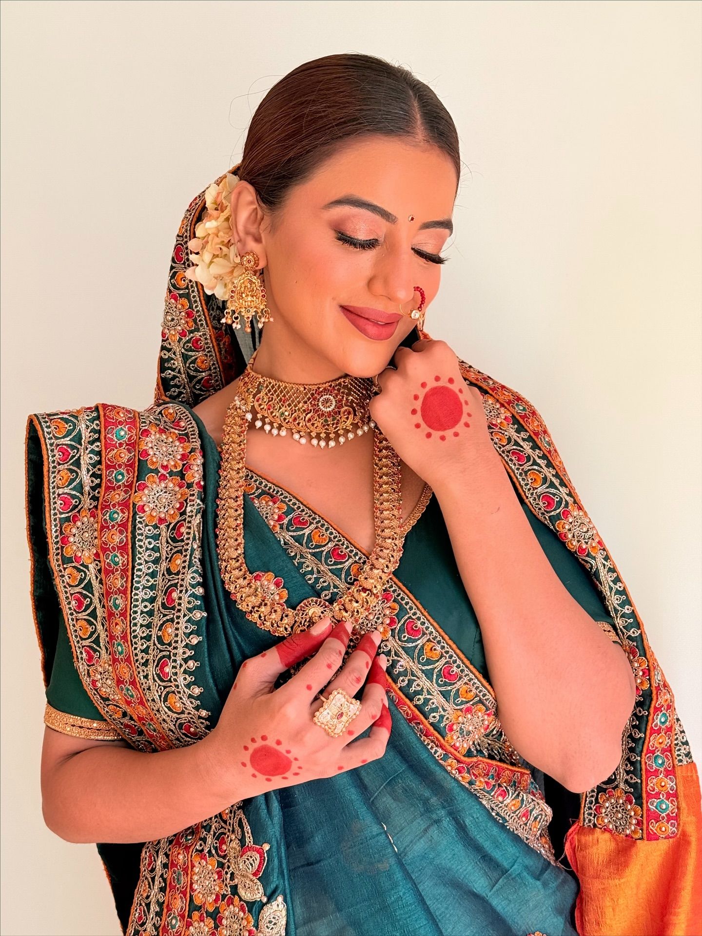 इस तस्वीर में अक्षरा ने एक हरी साड़ी पहनी है जिसमें सुनहरा जरी बॉर्डर और भारी एम्ब्रायडरी वाली साड़ी पहनी थी.