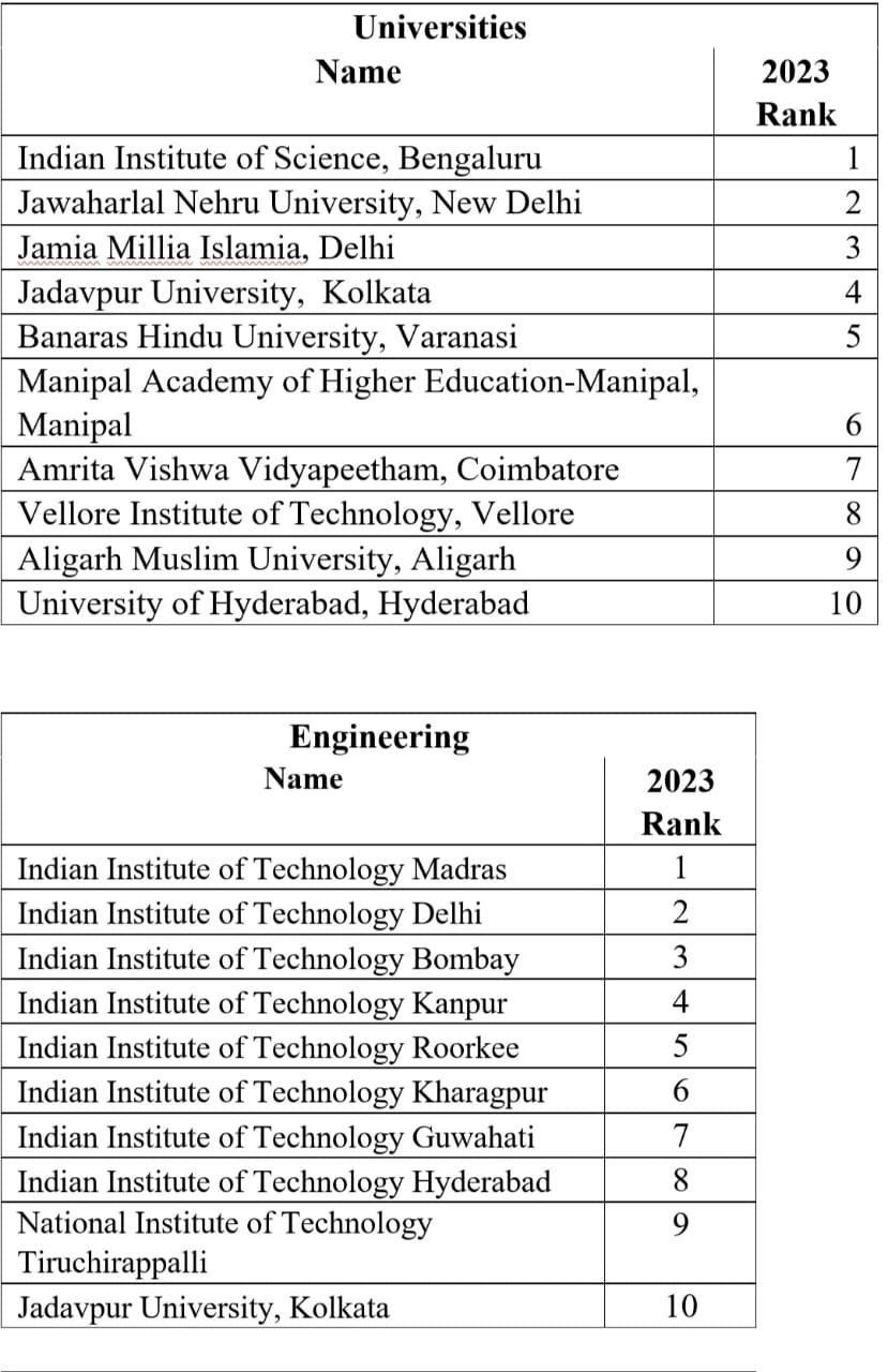 भारत सरकार के शिक्षा मंत्रालय की तरफ से नेशनल इंस्टिट्यूशनल रैंकिंग फ्रेमवर्क (NIRF) 2023 की रैंकिंग जारी कर दी गई है.